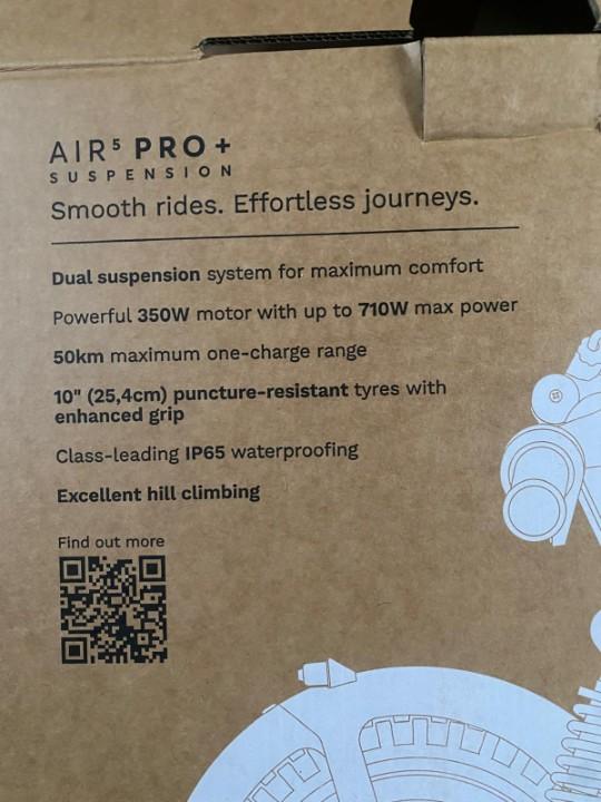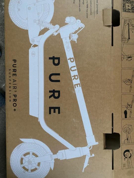 Its a Pure Air 5 pro+ suspension Used very little,still like new, comes with original box and original purchase receipt with warranty. Purchased late august 2025 ,being sold due to a change of circumstances 25km/hr max speed 59km total usage to date Has front suspension and rear shock absorbers Thumb throttle Brakes Lights- Rear brake light and front headlight, comes with additional reflectors Comes with charger and parking stand Scooter is foldable Scooter can be linked to an app for information on usage and the scooters settings. Overall it is an almost new high spec scooter with very little usage. Genuine reason for sale as its no longer required. Any queries or further information required please call or text
